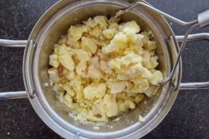 9. Voeg de rest van de knolselderij toe aan de aardappelen en stamp fijn. Voeg eventueel een klontje boter en een scheutje (plantaardige) melk of scheutje kookwater toe om het ietsje smeuïger te maken.