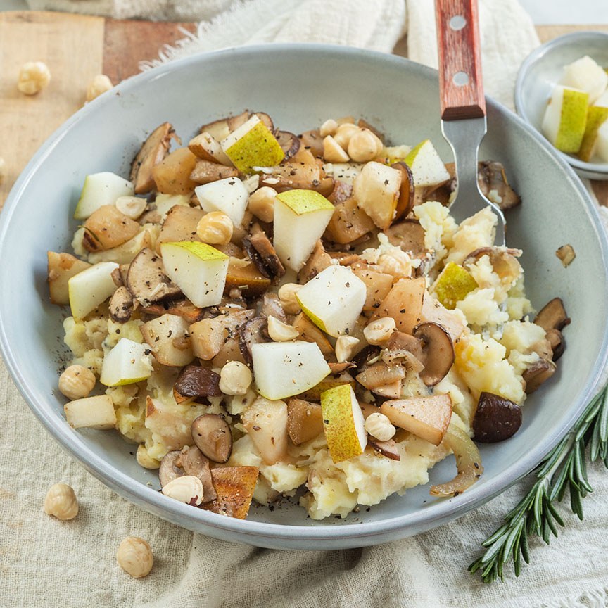 11. Roer ¾ van het champignonmengsel door de stamppot heen en verdeel de rest als topping eroverheen. Samen met nog wat hazelnoten.