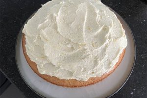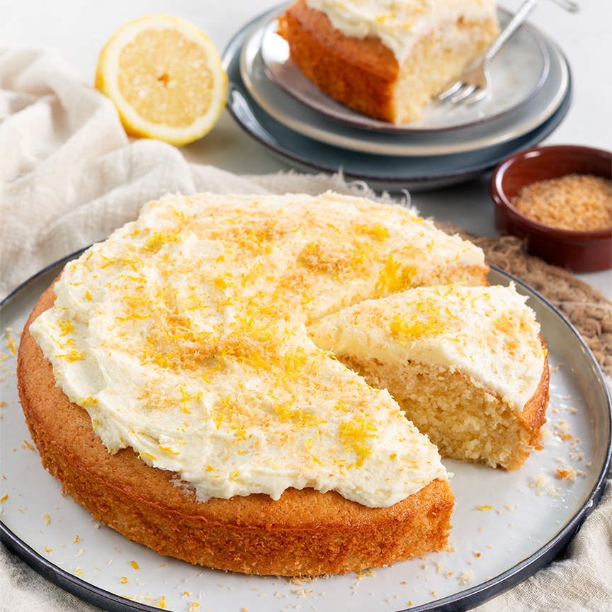 7. Laat de kokoscake afkoelen en besmeer de bovenzijde met de citroen botercrème.