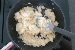 6. Doe het mengsel in een pan en verhit een paar minuten op middelhoog vuur. Zodra het een beetje aan de pan begint te plakken of te verkleuren schep je het terug in de mengkom en laat je het iets afkoelen.