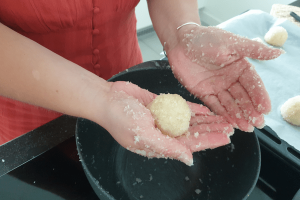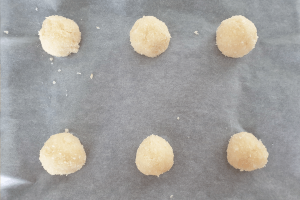 7. Maak met je handen of met 2 lepels 6 bolletjes die je iets aandrukt als je ze op de bakplaat legt.