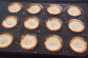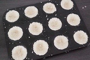 1. Verwarm de oven op 170 graden. Zorg dat er geen eigeel bij de eiwitten zit en je een schone kom en mixer gebruikt. Voeg de suiker en vanille toe aan de eiwitten en klop deze helemaal stijf. Je moet de kom op zijn kop kunnen houden zonder dat het mengsel er uit loopt. Roer dan de kokos er door. Vet de muffinvormpjes goed in. Neem een beetje van het kokosmengsel en kneed er een balletje van. Leg dit in de muffinvorm en druk er een kuil in het midden.