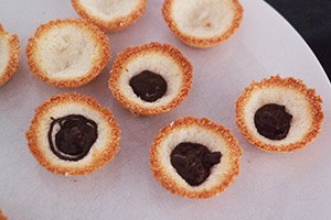 2. Bak de kokosnestjes 15 minuten en laat ze daarna afkoelen. Smelt ondertussen de chocolade au bain-marie. Haal de kokosnestjes voorzichtig uit de vormpjes. Snijd ze eventueel een beetje los met een mesje. Schep een beetje van de gesmolten chocolade in het midden en doe de paaseitjes er in. Je kunt ook één paasei per nestje er in doen.