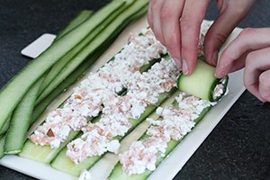 2. Smeer een laagje van het zalmmengsel over iedere plak komkommer en rol ze op. Zet vast met een prikkertje.