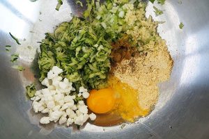 1. Rasp de courgette en doe deze in een schone theedoek. Knijp er zoveel mogelijk vocht uit. Doe de geraspte courgette in een kom. Snijd de 2 teentjes knoflook en bosui fijn. Houdt 1 teentje van de fijngesneden knoflook apart. Voeg de knoflook en bosui toe aan de kom met courgette. Doe vervolgens ook het ei, de amandelmeel en komijn erbij. Verkruimel de feta over de kom en roer dit tot een geheel. Breng het op smaak met peper en zout.