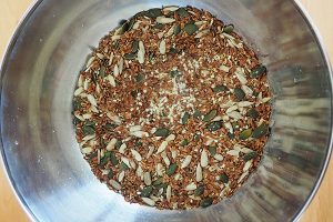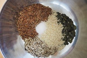 1. Meng in een kom de droge ingrediënten door elkaar: het gebroken lijnzaad, de gemengde pitten en zaden en het zout. Voeg het water toe en roer dit goed door. Laat dit circa 30 minuten staan. Hierdoor nemen de pitten en zaden het vocht op.