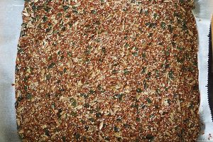 3. Bekleed een bakplaat met bakpapier en verdeel het mengsel over de bakplaat. Spreid deze dun uit. Zet voor 25 minuten in de oven.