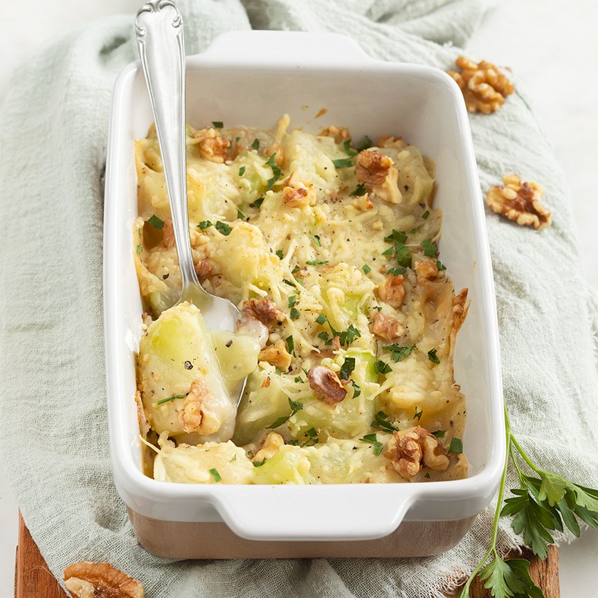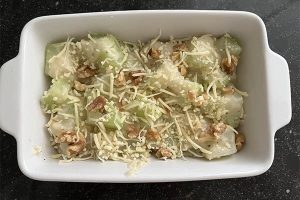 4. Schep de blokjes koolrabi door de saus. En doe vervolgens in een ingevette ovenschaal. Bestrooi met de rest van de kaas en grof gehakte walnoten.