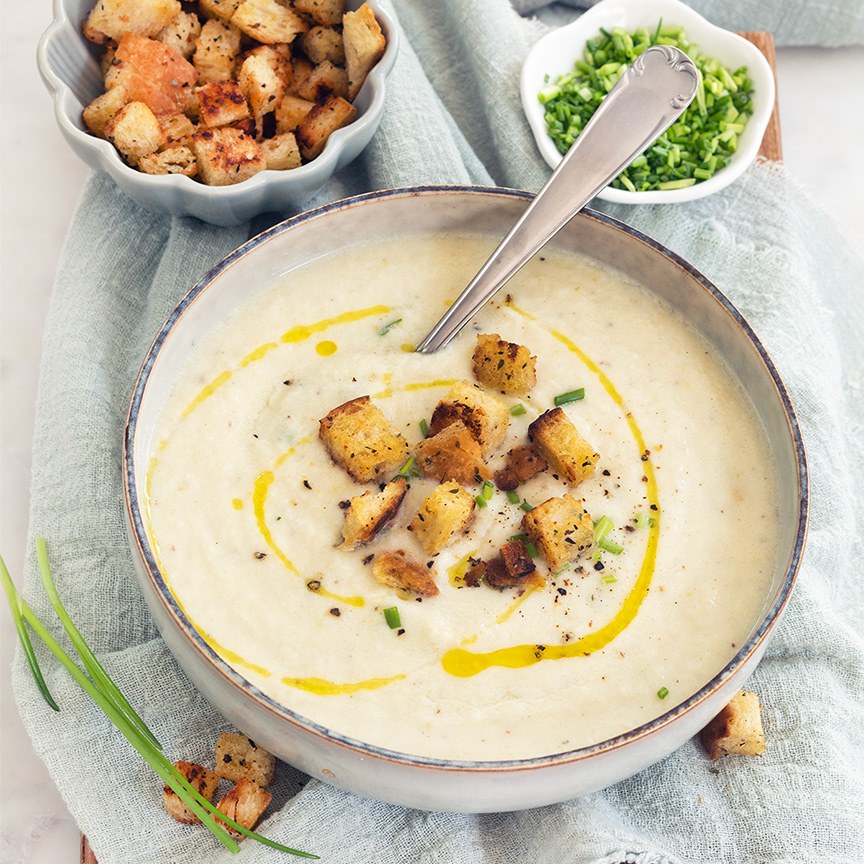 6. Serveer de soep van koolrabi eventueel met wat verse kruiden zoals bieslook of peterselie en (zelfgemaakte) croutons.