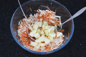3. Snijd de appel in kleine blokjes en hak de walnoten grof. Meng door de kool en peen in de kom.