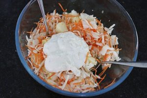 4. Voeg de dressing toe aan de koolsalade. Schep goed door elkaar zodat de dressing goed verdeeld is.