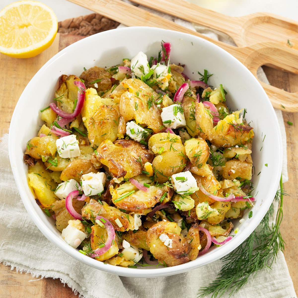6. Drizzle de citroendressing over de krokante aardappels. Verdeel de ingelegde rode ui en verbrokkelde feta over de aardappelen. Bestrooi royaal met verse dille en bieslook. Meng alles lichtjes voor het serveren.