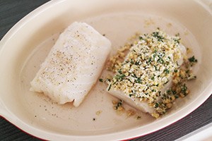 2. Doe ondertussen de panko, walnoten en peterselie in een keukenmachine en maal fijn. Leg de vis in een ingevette ovenschaal. Bestrooi de vis met een snufje peper en zout. Verdeel het kruimelmengsel over de vis en druk iets aan. Zet de vis ca 15 minuten in de oven tot hij gaar is. Haal het blaadje laurier voor het serveren er uit. Schep of giet wat witte wijnsaus op een bord en leg een stukje vis hierin. Lekker met een salade en wat aardappeltjes.