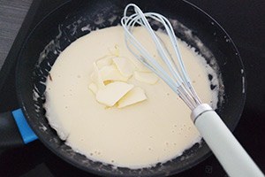 1. Verwarm de oven op 200 graden. Doe de wijn in een pan en verwarm deze. Laat de alcohol verdampen en de saus 10 minuten pruttelen en inkoken. Giet de slagroom er bij en voeg het blaadje laurier toe en laat nog 10 minuten pruttelen. Breng de saus op smaak met een snufje peper en zout. Voeg de boter in stukjes toe en roer door de saus met een garde. Laat de saus nog iets indikken.