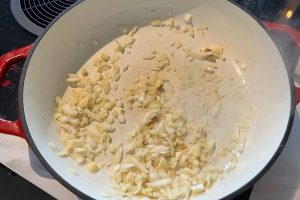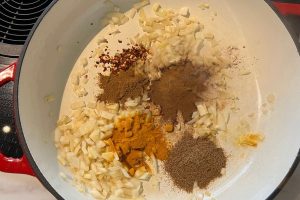 2. Zet een ruime pan op het vuur en verhit de olijfolie. Voeg de ui, knoflook en gember toe en bak glazig, ongeveer 3-4 minuten.