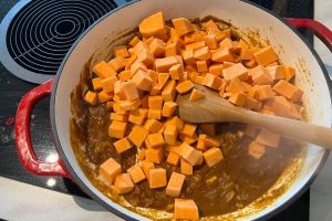 1. Maak de ui, knoflooktenen en verse gember schoon en snijd allemaal fijn. Schil de zoete aardappels en snijd deze in blokjes.