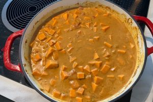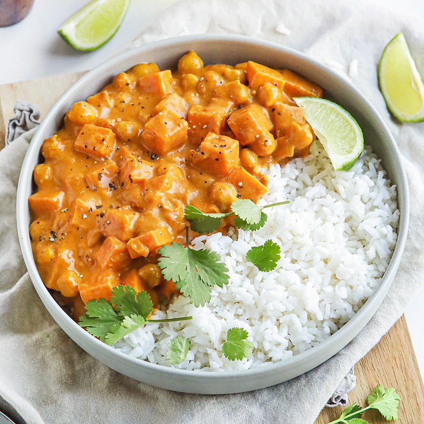 6. Proef en voeg naar smaak peper, zout en eventueel wat limoensap toe. Serveer de curry daarna meteen met rijst of naanbrood en garneer met fijngehakte pinda’s en/of peterselie/koriander.