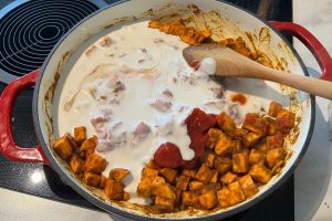 4. Doe de zoete aardappelblokjes in de pan en schep het er goed doorheen. Bak kort mee. Voeg daarna de tomatenblokjes en kokosmelk toe. Roer goed door en kruimel dan een groentebouillonblokje in de pan. Verlaag het vuur en laat 20 minuten sudderen met de deksel op de pan.