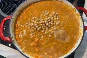5. Spoel de kikkererwten goed af en voeg deze toe. Doe ook de pindakaas erbij en roer alles goed door. Laat de curry daarna nog 5-10 minuten op een laag vuur sudderen en roer het regelmatig door.