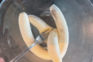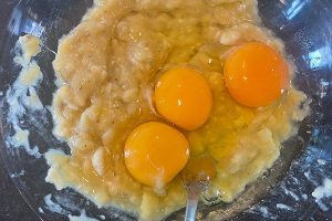 2. Prak de bananen en klop de eieren erdoorheen.