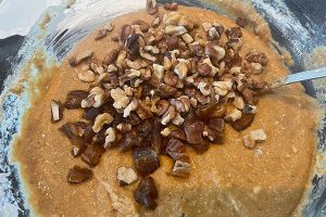 5. Hak de walnoten en dadels in kleine stukjes en voeg toe.