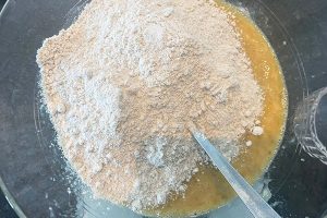 4. Schep er vervolgens het speltmeel, bakpoeder, kokosbloesemsuiker en snuf zout bij en roer erdoorheen.