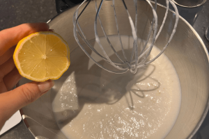 1. Klop de plantaardige slagroom lobbig. voeg daarna de kokosmelk toe. Mix dit rustig mee tot het een geheel is.