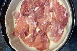 3. De verse spinazie snij je ondertussen fijn en de zongedroogde tomaat in reepjes. Verdeel de helft van de parmaham over de bodem van de quiche