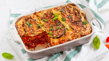 2. Vet de muffinvorm in en druk hier een vierkantje lasagnevel in. Schep hier een beetje tomatensaus in en een theelepel ricotta. Leg een ander lasagnevelletje er op en leg hier een gegrilde courgette op en weer wat saus en ricotta. Bestrooi met wat mozzarellakaas en bak 25 minuten in de oven. Garneer met wat verse basilicum.