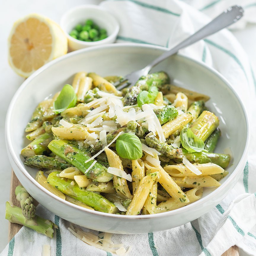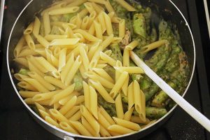 8. Voeg als laatste de pasta toe en een beetje kookvocht zodat je een smeuïge saus krijgt. Breng de lente pasta eventueel op smaak met een beetje peper en zout.