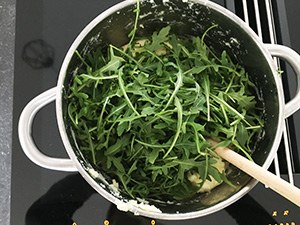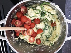 2. Schep dan de rucola er door. Halveer de tomaatjes en voeg deze ook als laatste toe. Garneer de stamppot met wat extra rucola en de pijnboompitjes. Lekker met een stukje vlees of vis.