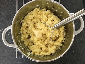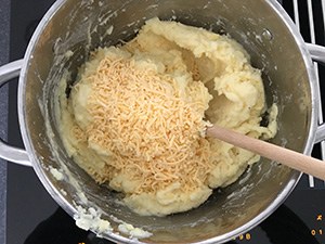 1. Kook de aardappels in een pan met water ca 15 tot 20 minuten tot ze gaar zijn. Giet ze af en stamp ze fijn met de boter en een snuf nootmuskaat, peper en zout. Giet beetje bij beetje de warme melk er bij. Roer de kaas er door en laat smelten.