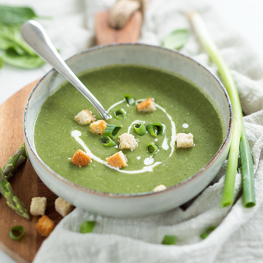 5. Serveer de soep met wat croutons of grissini stengels en garneer eventueel met wat lente ui en/of aspergekopjes. Ook lekker met wat gebakken stukjes bacon en/of een gepocheerd ei er in.