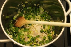 2. Snijd de lente uien in ringetjes, snipper de ui en knoflook fijn en fruit dit samen in een soeppan met een beetje olie.