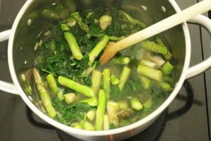 3. Voeg de asperges en spinazie toe en roerbak een paar minuten mee.