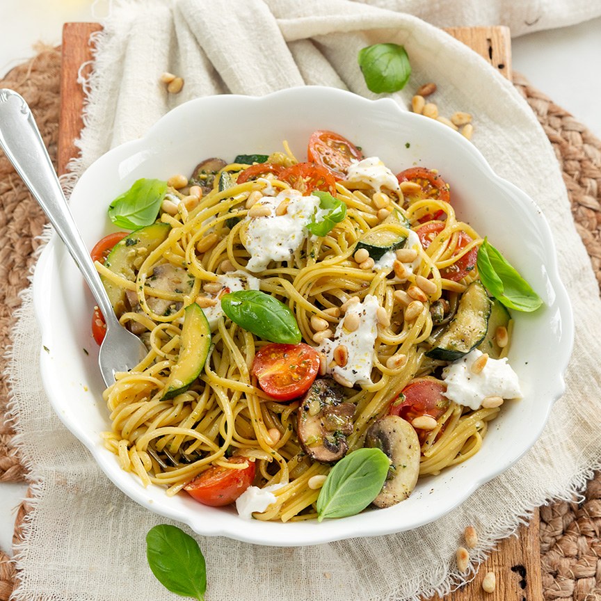 5. Serveer de linguine met groenten op borden. Snijd of trek de burrata in stukken en verdeel over de pasta. Maak het af met wat geroosterde pijnboompitjes en verse basilicum.