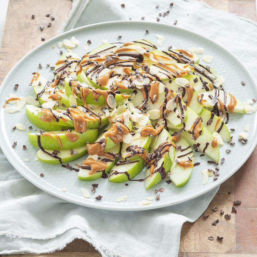 4. Verdeel nu de pindakaas en gesmolten chocolade over de partjes appel. Maak af met de cacaonibs en de geschaafde amandelen.