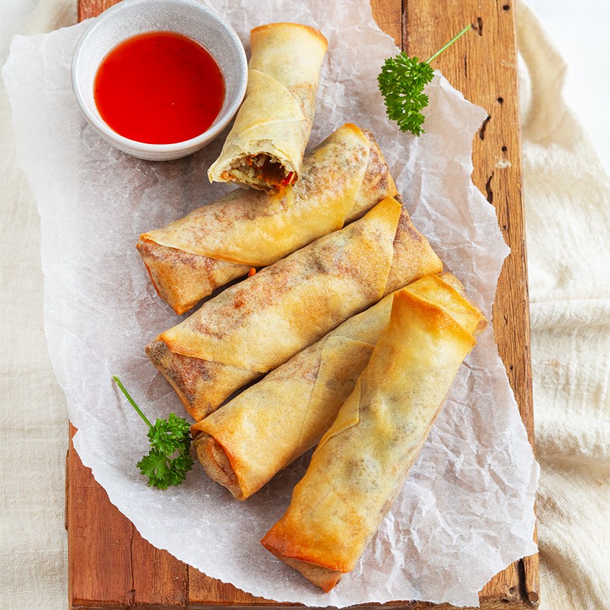 7. Verwarm de airfryer voor op 200 graden. Plaats de loempia’s in de Airfryer en bak ze in ongeveer 10 minuten goudbruin en knapperig. Bak er ca. 5 per keer. Draai ze halverwege de baktijd even om.