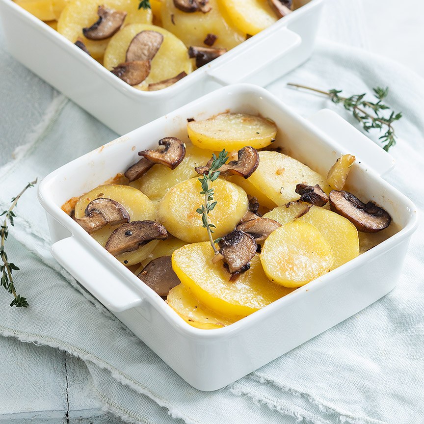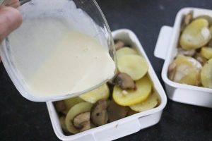 5. Vet de vormpjes of ovenschaal in met boter of olie. Verdeel de aardappelschijfjes en champignons over de schaal(tjes). Giet het roommengsel erover en zet de schaal(tjes) ca. 35 minuten in de oven. Als je 1 grote ovenschaal maakt wellicht iets langer. Controleer voor het serveren of de aardappeltjes gaar zijn.