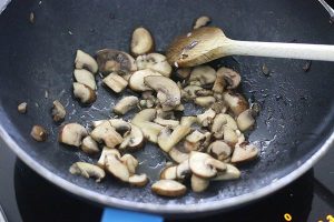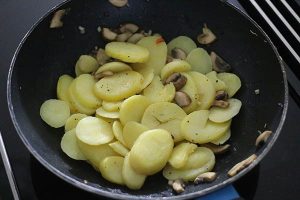 3. Verhit een beetje olie en/of boter in een koekenpan en voeg de champignonschijfjes toe en bak ze een paar minuutjes. Voeg de olijfolie met truffel toe en roer erdoor. Schep de licht gebakken champignons door de aardappelschijfjes.