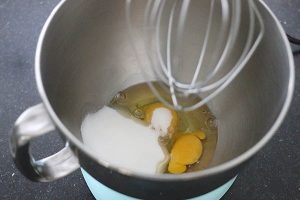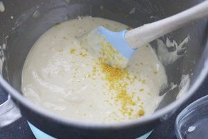 1. Smelt de boter in een pannetje. Mix de eieren en suiker 5 minuten in een kom tot deze licht en schuimig zijn geworden. Voeg de gesmolten boter en citroenrasp toe en mix nog kort even door. Spatel dan de bloem met het bakpoeder er door. Zet het beslag minimaal 1 uur in de koelkast.