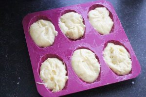 2. Verwarm de oven op 190 graden. Vet de madeleine vormpjes in met een beetje boter (of gebruik zoals ik een siliconen vorm). Vul de vormpjes met een beetje van het beslag. Vul ze tot net onder de rand. Bak de madeleines in 8 tot 10 minuten gaar en goudbruin in de oven. Als de cakejes klaar zijn moeten ze een klein ‘buikje’ hebben aan de bovenzijde. Bestrooi eventueel nog met poedersuiker.