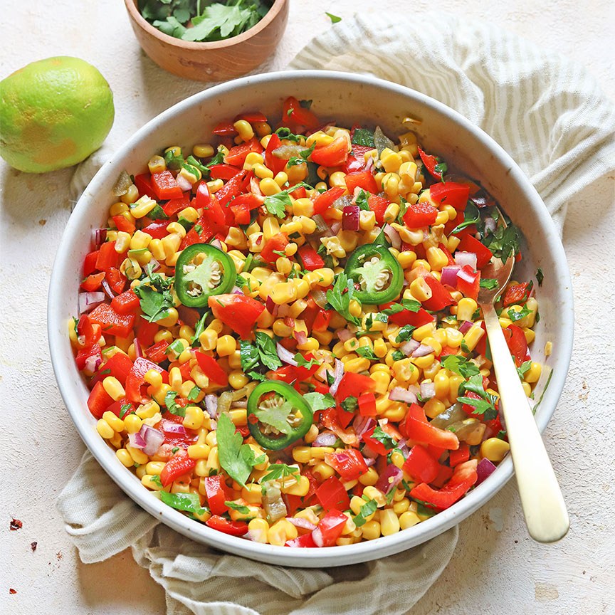 3. Doe vervolgens alle ingrediënten bij de maïs in de grote schaal. Breng op smaak met de limoensap, olijfolie, peper, zout en de chili vlokjes en je maïssalade is klaar!