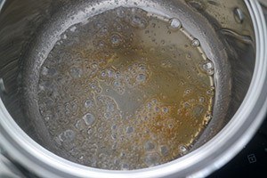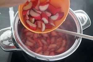 1. Was de rabarber en snijd de stelen in stukjes van ca 1 cm. Doe 1/3 van de suiker in een pannetje met het warme water en verwarm deze totdat de suiker helemaal gesmolten is. Zet het vuur wat hoger en laat het mengsel borrelen. Zodra de bellen lichtbruin beginnen de kleuren voeg je 2/3 van de rabarber toe.