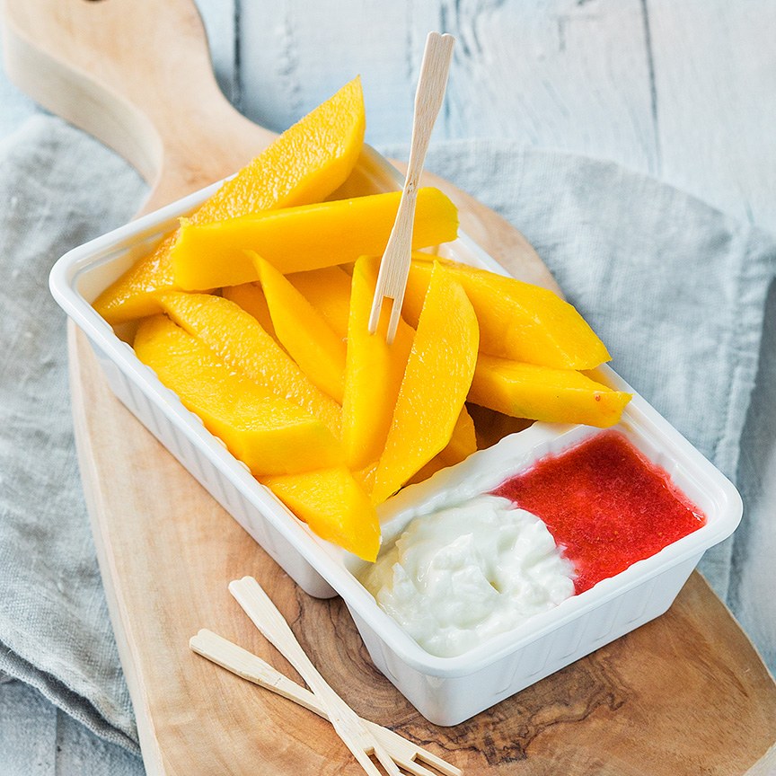 Tip: Maak je deze snack van tevoren klaar? Bewaar de mangofrietjes en aardbeienpuree dan afgedekt met folie in de koelkast.