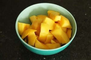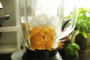 1. Doe de mango in blokjes samen met de yoghurt en ijsblokjes in een blender.
