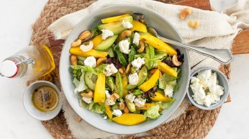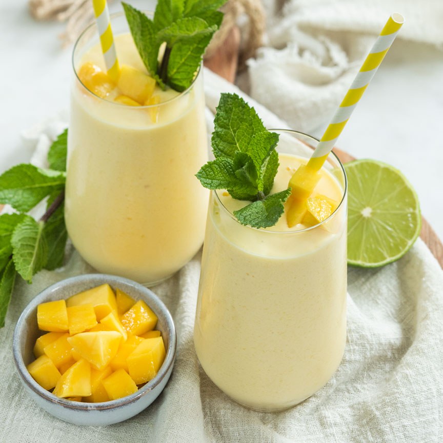 3. Schenk de mango lassie uit in glazen en steek er een pluk munt en een rietje in. Garneer eventueel met wat kleine stukjes mango.