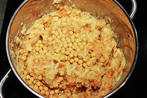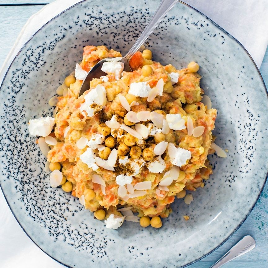2. Laat de kikkererwten uitlekken en spoel ze af. Schep ze door de stamppot. Maak de Marokkaanse stamppot af met wat geitenkaas en amandelschaafsel.