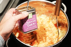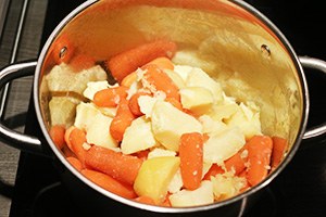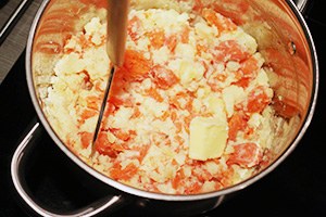 1. Zet een grote pan met water op en voeg de aardappels en wortel toe (of kook ze in aparte pannen). Kook ze in ca. 15 min. gaar. Giet ze af en stamp fijn met een scheutje melk, boter, ras el hanout kruiden, peper en zout.