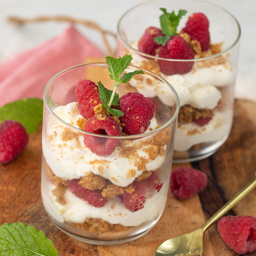 6. Werk de glaasjes af met het achtergehouden koekjeskruim en een takje verse munt. Een paar extra frambozen bovenop maken het extra feestelijk.